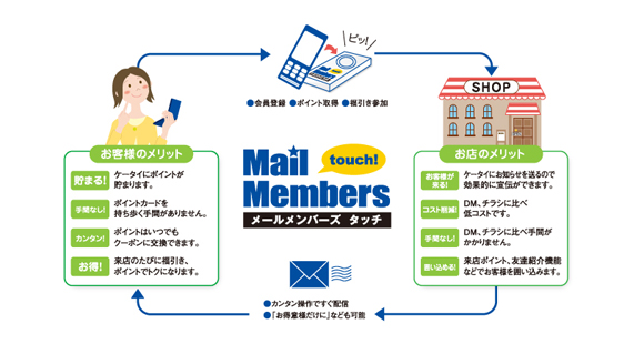 メールメンバーズタッチは、お店に来れば来るほどお客様がトクをする仕組みを、誰もが持っているケータイを用いて実現します。一度来店されたお客様をつかんで離しません。